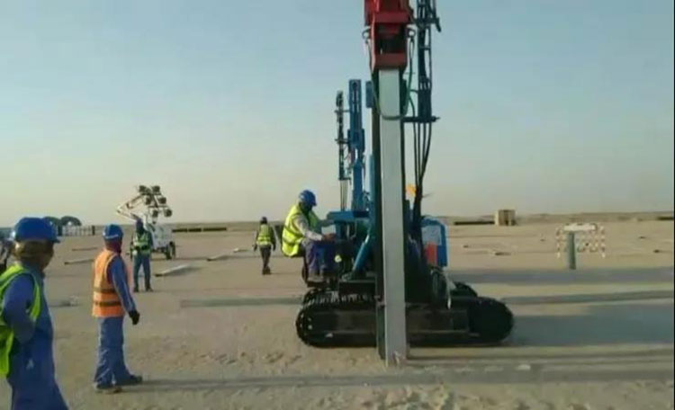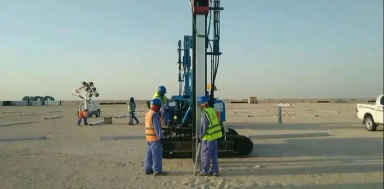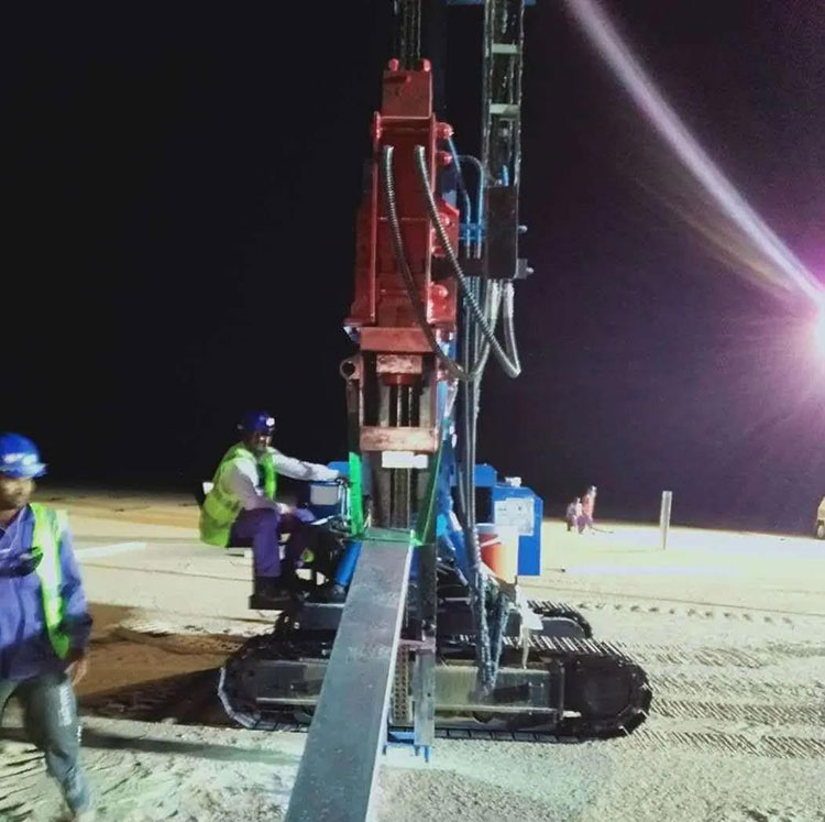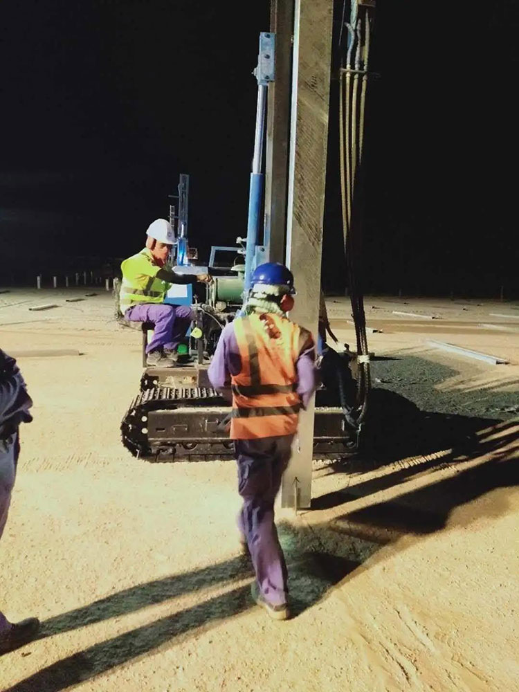 恒旺光伏打樁機助力阿聯(lián)酋迪拜950MW光熱光伏混合項目。光伏打樁機24小時(shí)不間斷作業(yè),設備依舊正常運行!工作效率和設備質(zhì)量得到工作人員的一致認可!