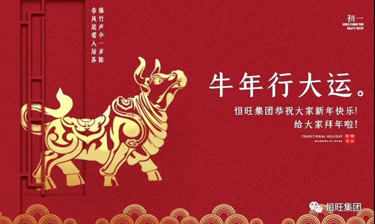 恒旺集團攜全體員工給您拜年啦!祝您牛年大吉,好運如潮,意氣風(fēng)發(fā),萬(wàn)事順心,財源滾滾,福壽百年,吉祥平安,人旺運旺,闔家歡樂(lè ),萬(wàn)事如意!